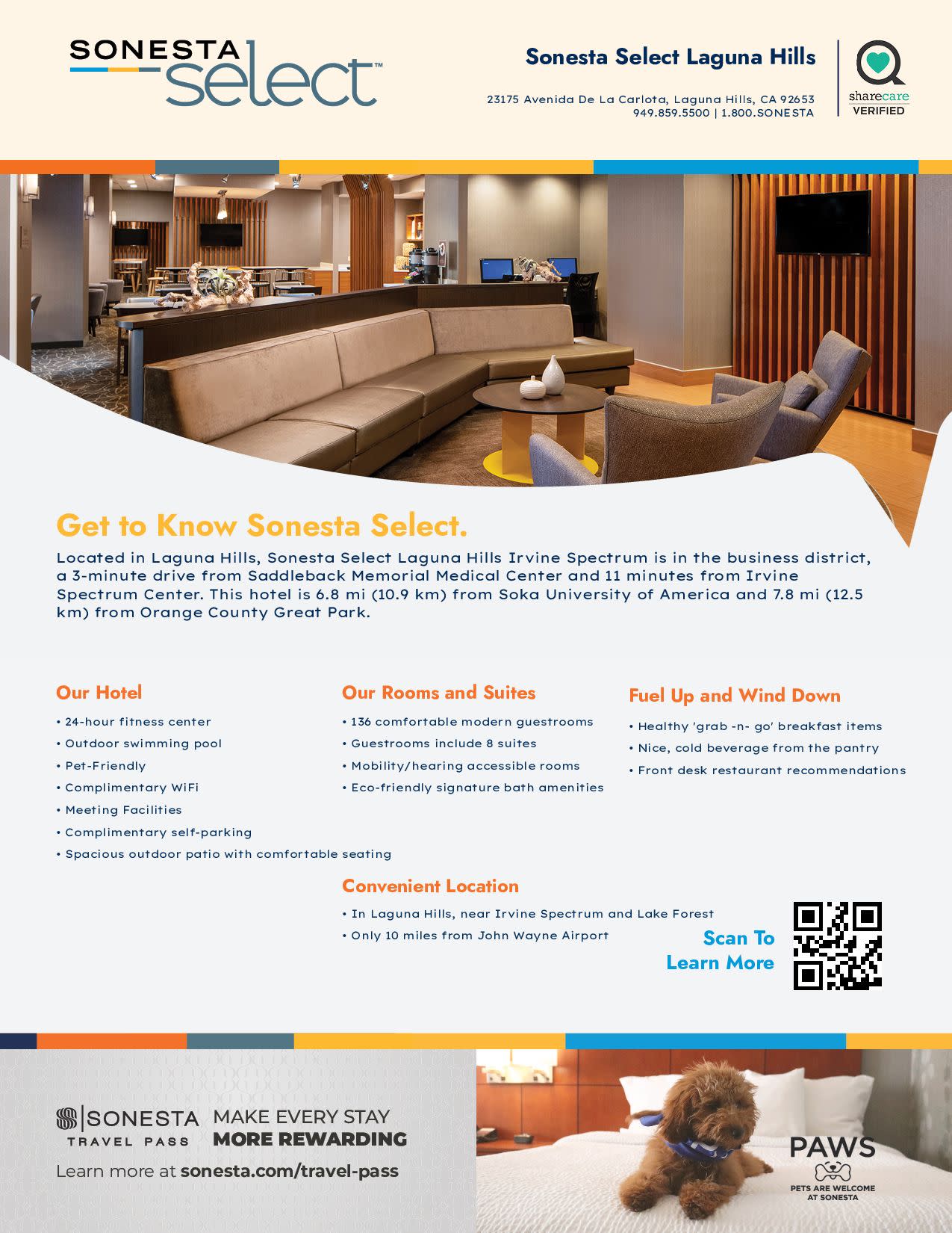 Put a little play in your stay at the Sonesta Select Laguna Hills Irvine Spectrum. Our Laguna Hills hotel offers spacious accommodations and award-winning service minutes from Soka University, Orange County Great Park, Irvine Spectrum Center, Irvine Improv, and Laguna Beach. Enjoy all our pet-friendly hotel has to offer including parking, a well-equipped fitness center, and a seasonal outdoor pool. We look forward to providing you with Laguna Hills accommodations that exceed your expectations. With Sonesta Select, it’s the kind of stay you’ll want to write home about.