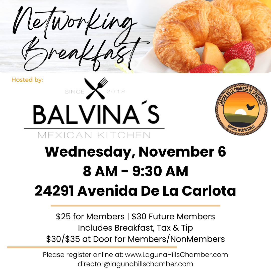 Join us for an early morning Networking Breakfast! All attendees will have the ability to introduce themselves and talk about their business, all while enjoying a delicious hot breakfast. Bring your 30 second commercial, business cards, and a guest!