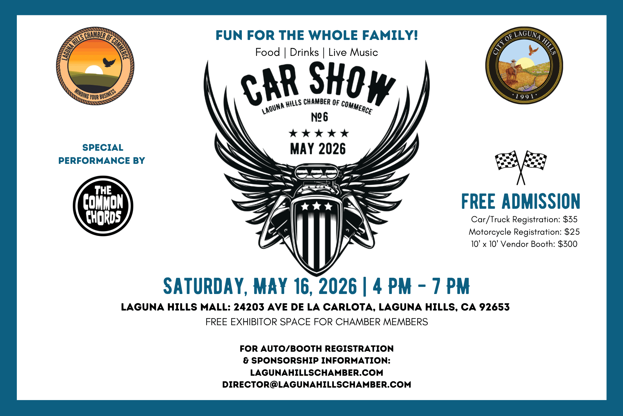 π Registration opening next week!Classic cars, trucks, motorcycles, exhibitors, and volunteers (ages 14 to adult) are all welcome to join the 5th Annual Laguna Hills Car Show on Saturday, May 16th, 2026, at the Laguna Hills Mall.