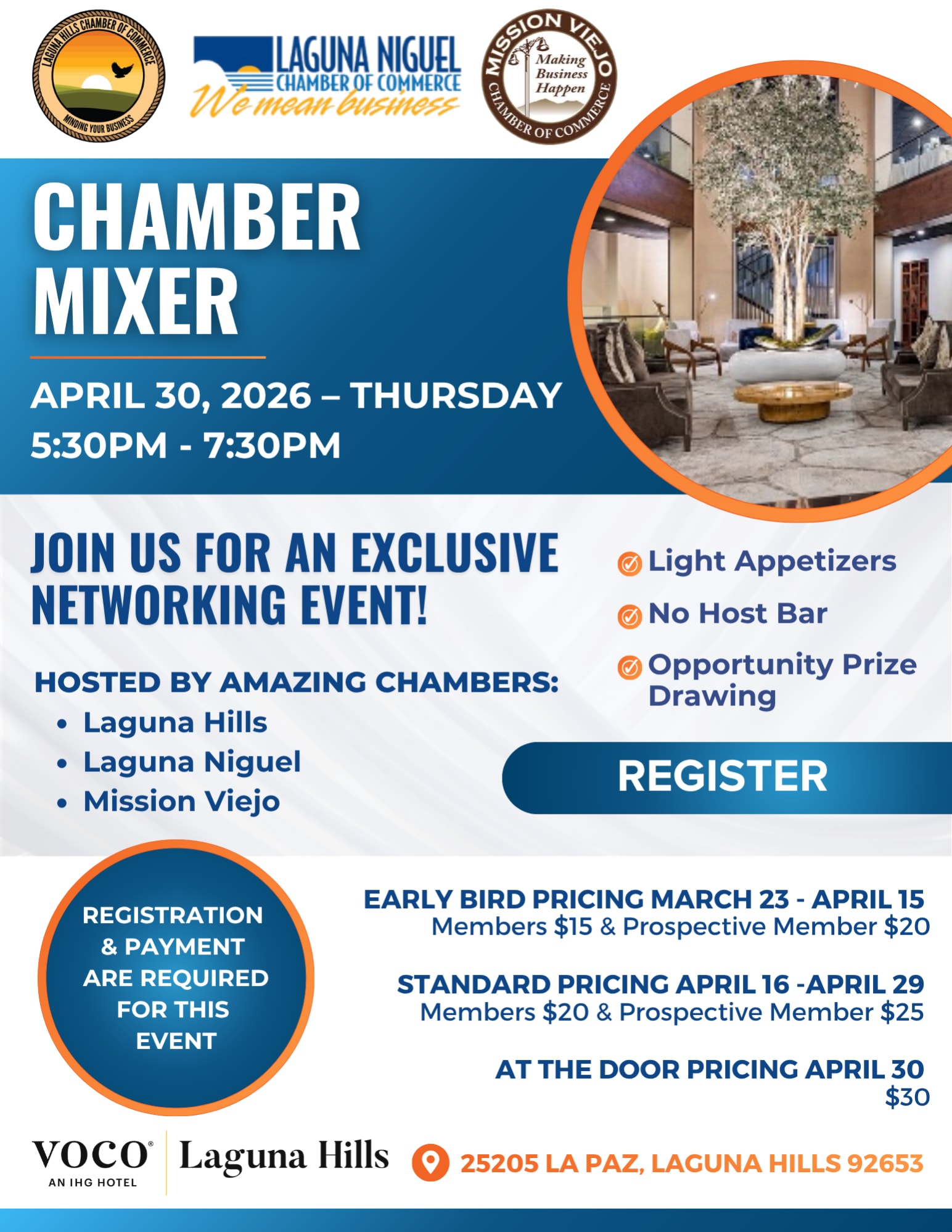 Join us for a high-energy Tri-Chamber Mixer with the Laguna Hills, Laguna Niguel, and Mission Viejo Chambers of Commerce—and let’s make sure Laguna Hills is well represented!
